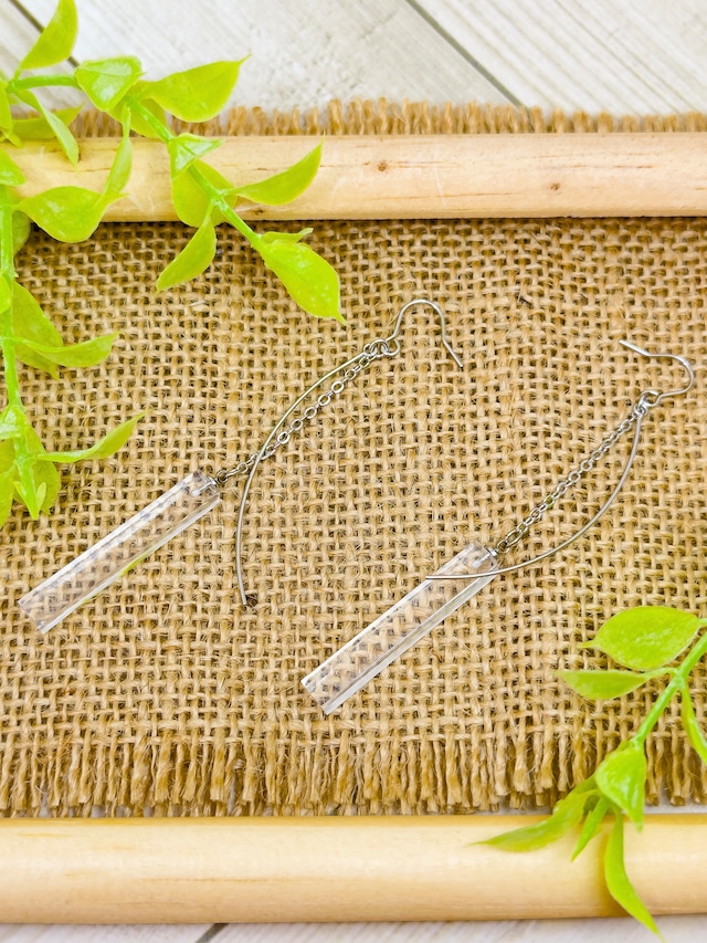 シンプルに揺れる夏のデイリーカジュアル! まるでアメリカンピアスのようなデザイン。 シンプルで軽いピアスです。(イヤリング変更可) スクエア型よりもカジュアル感の強く、カラーがシルバー×クリアなので、どんなお洋服にも相性◎ 揺れ感も楽しめて長く愛用出来る一品です。 ※ピアス(イヤリング)金具を必ず選択して下さい。 一部別途料金が掛かる場合が御座います。 必ずご確認下さいませ。 素材:金属(メッキ)・合成樹脂(レジン) カラー:ロジウム(シルバー)・クリア 重量:約1g 全長:約7.3cm 横幅:最大5mm 厚み:最大5mm