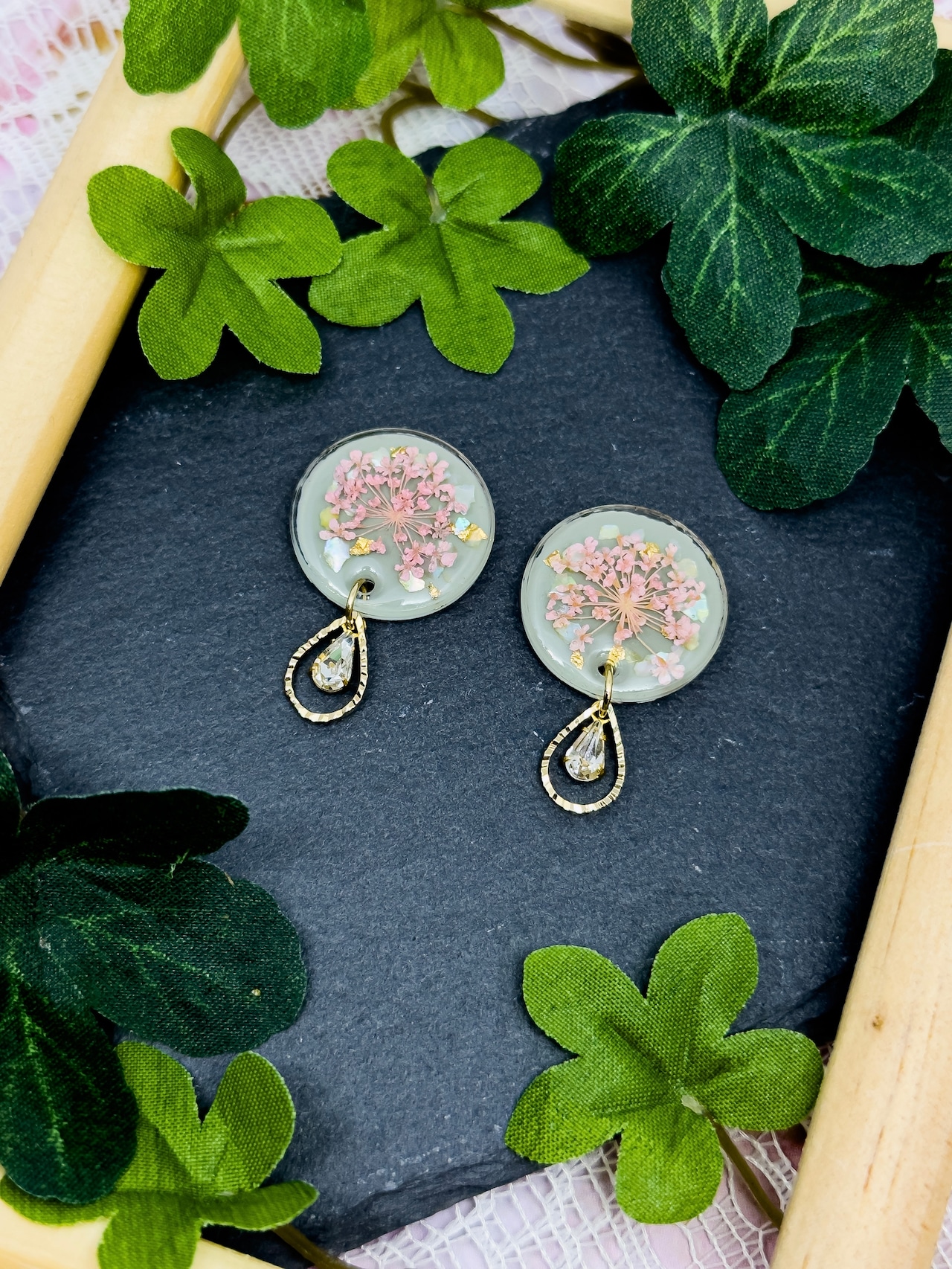 素材:金属(メッキ)・合成樹脂(レジン)・ドライフラワー・シェル・ガラス