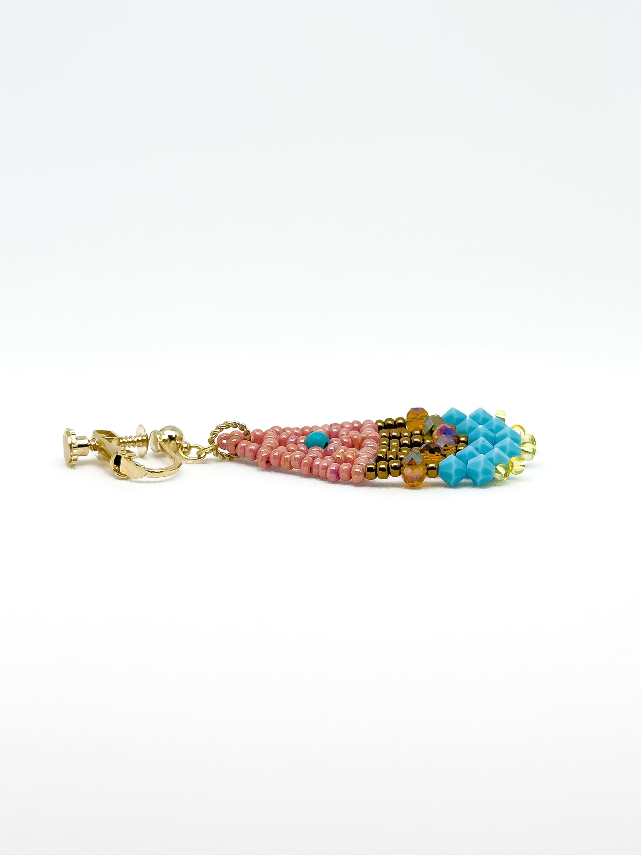 敢えて使用したビーズの丸みが、ソロバンカットのビーズのクールさを緩和しカジュアルな印象を与えてくれます。